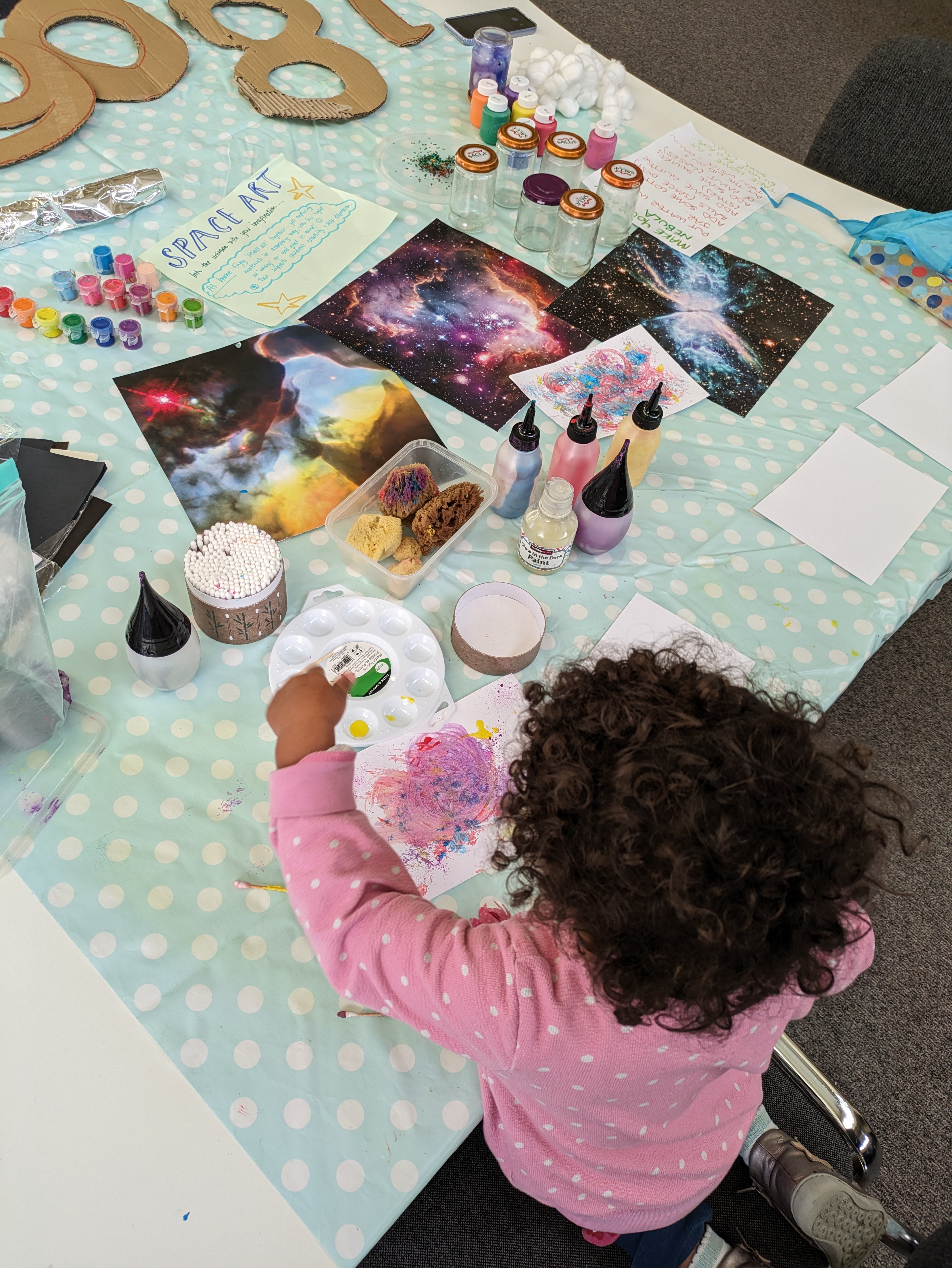 We usually begin with an ‘opening circle’ - a welcome song to introduce everyone and the theme for the session. Perhaps you could teach us how to say ‘hello’ in another language? If your child has a favourite song, this would be a lovely moment to suggest it and sing it together! Then there are several activities set up relating to session theme, such as the moon, Frieda Kahlo or winter. Activities are open-ended, which means that the children can engage with them in any way they want to - there’s no right or wrong. The aim is to give them inspiration for their play but to follow the child! Finally, we eat together and help tidy up.